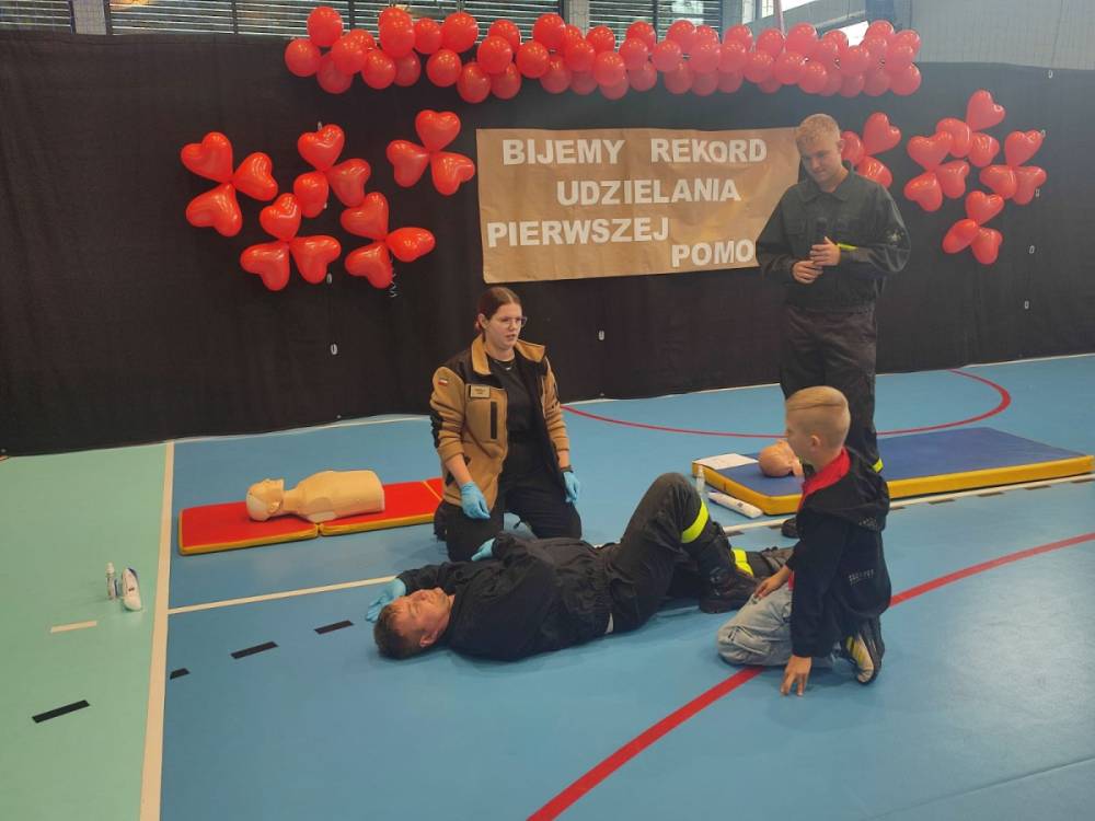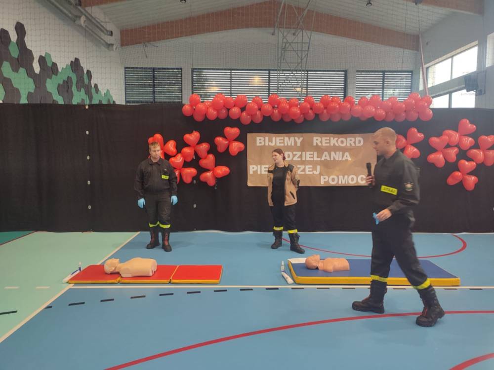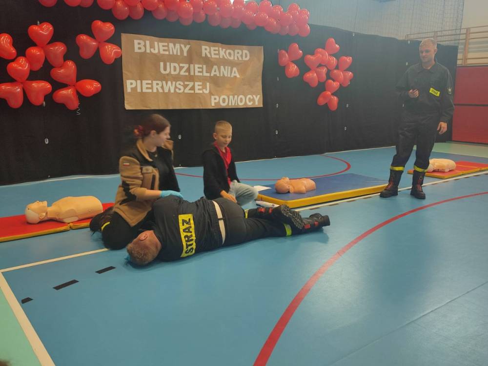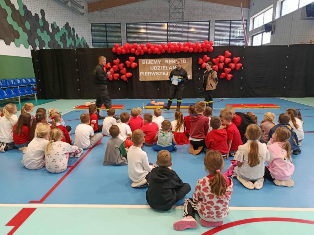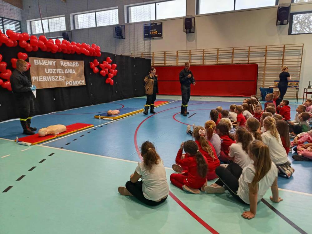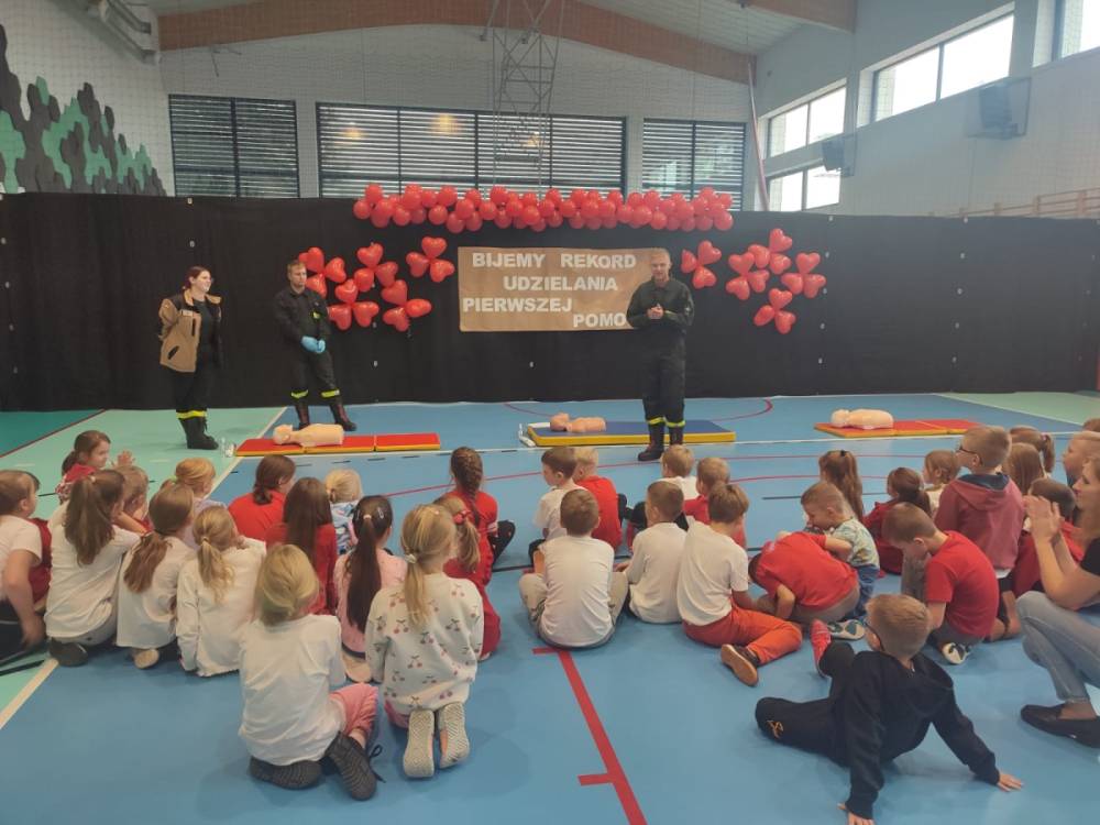 Zanim rozpoczęło się bicie rekordu, druhowie strażacy przeprowadzili krótkie, ale bardzo ciekawe zajęcia z pierwszej pomocy. Dzieci dowiedziały się, jak rozpoznać sytuację zagrożenia życia, jak sprawdzić przytomność poszkodowanego oraz w jaki sposób prawidłowo wezwać pomoc. Strażacy zaprezentowali także technikę wykonywania uciśnięć klatki piersiowej i wdechów ratowniczych, zachęcając tym samym uczniów do samodzielnego ćwiczenia na fantomach.