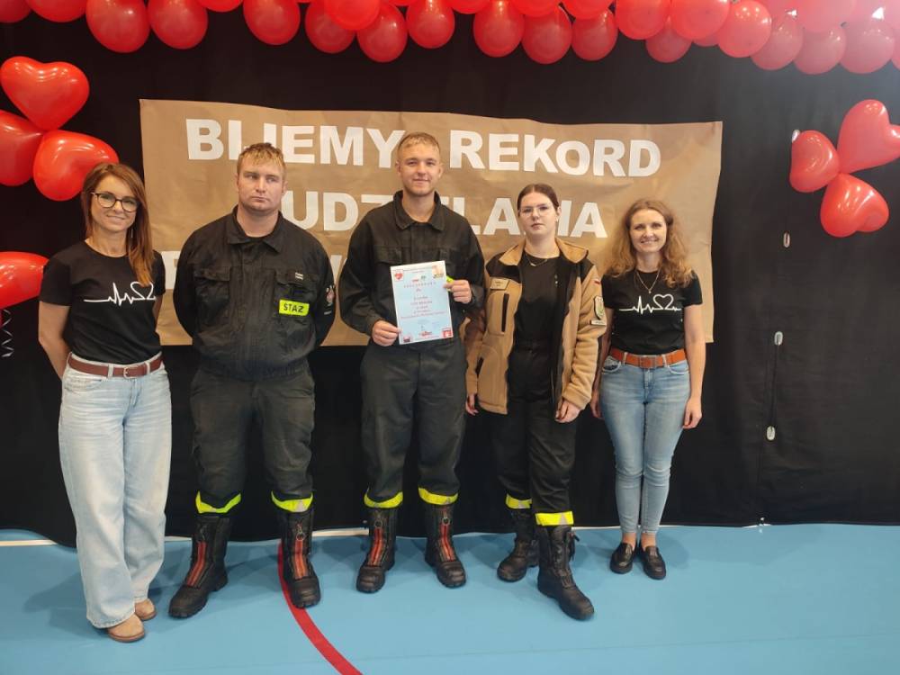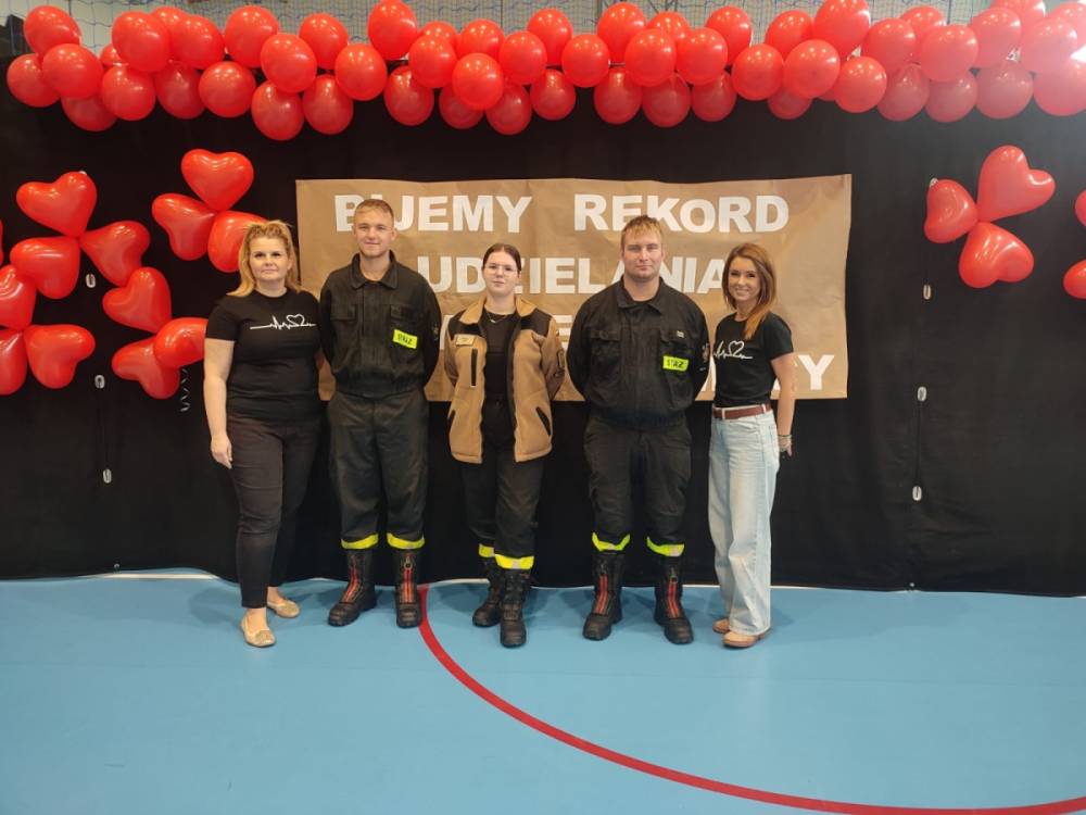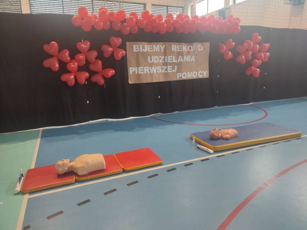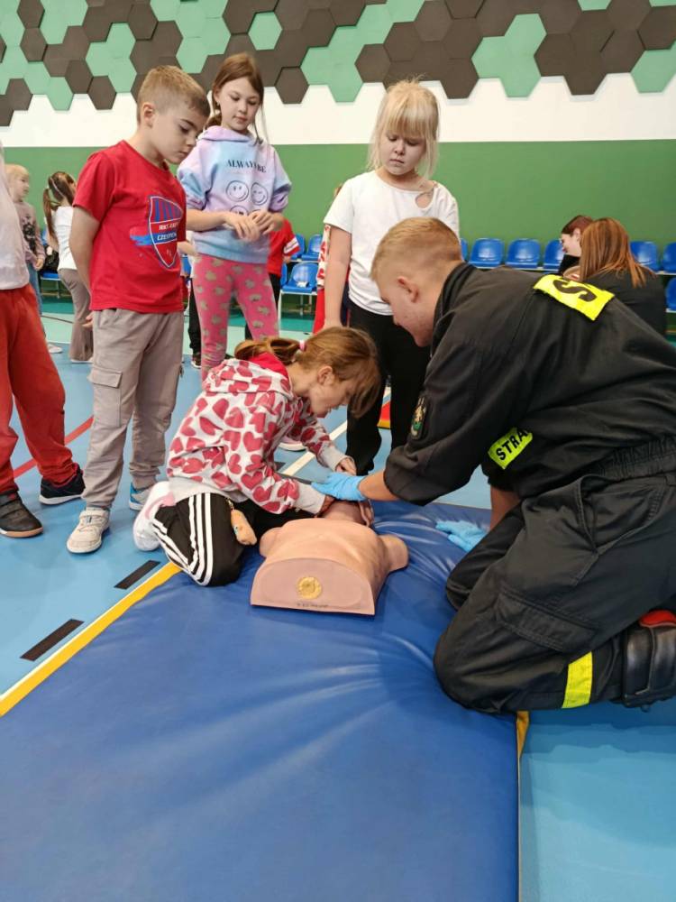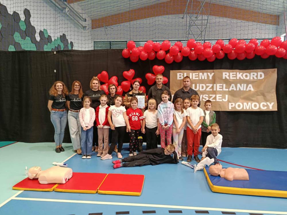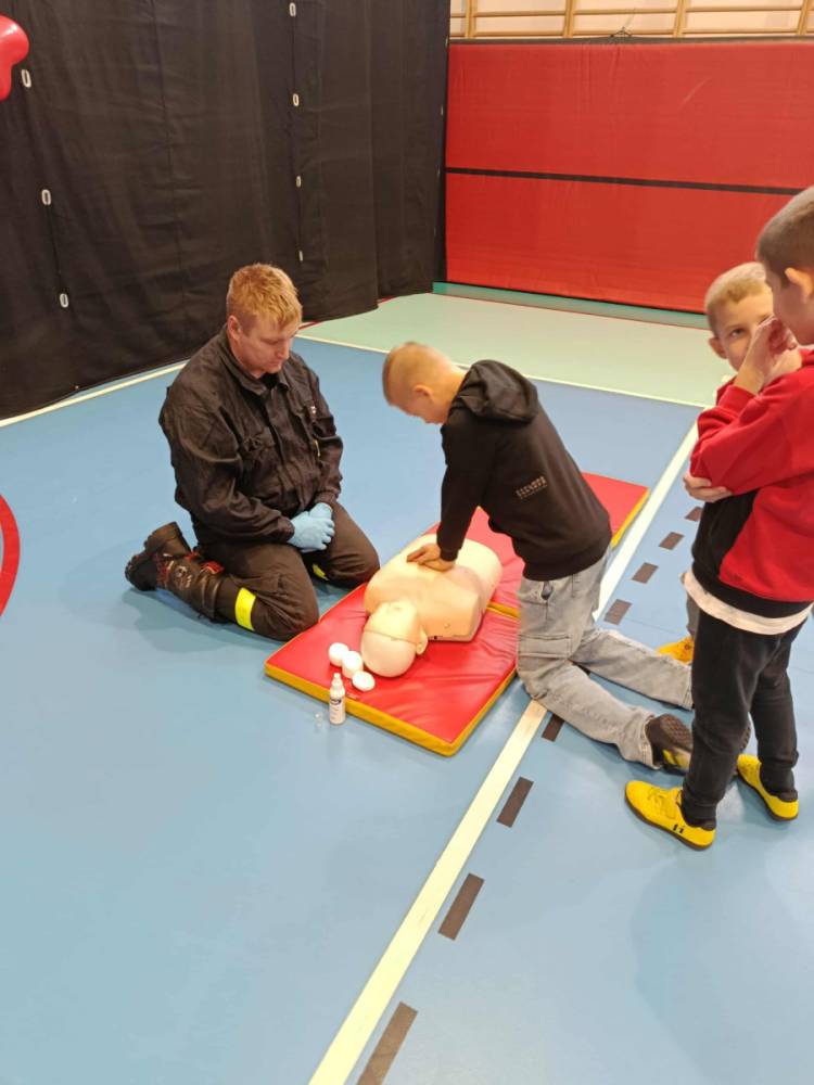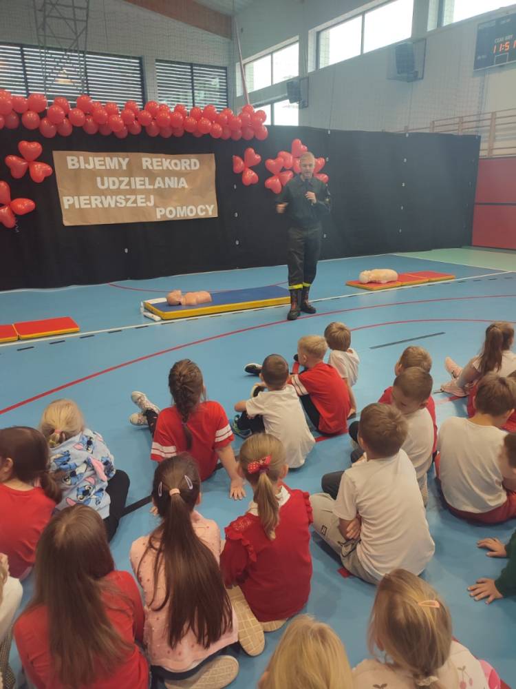 Zanim rozpoczęło się bicie rekordu, druhowie strażacy przeprowadzili krótkie, ale bardzo ciekawe zajęcia z pierwszej pomocy. Dzieci dowiedziały się, jak rozpoznać sytuację zagrożenia życia, jak sprawdzić przytomność poszkodowanego oraz w jaki sposób prawidłowo wezwać pomoc. Strażacy zaprezentowali także technikę wykonywania uciśnięć klatki piersiowej i wdechów ratowniczych, zachęcając tym samym uczniów do samodzielnego ćwiczenia na fantomach.