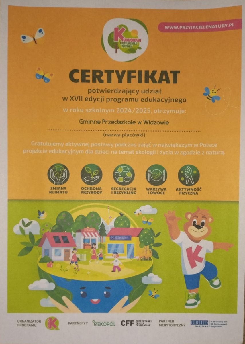 Certyfikat Kubusiowi Przyjaciele Natury